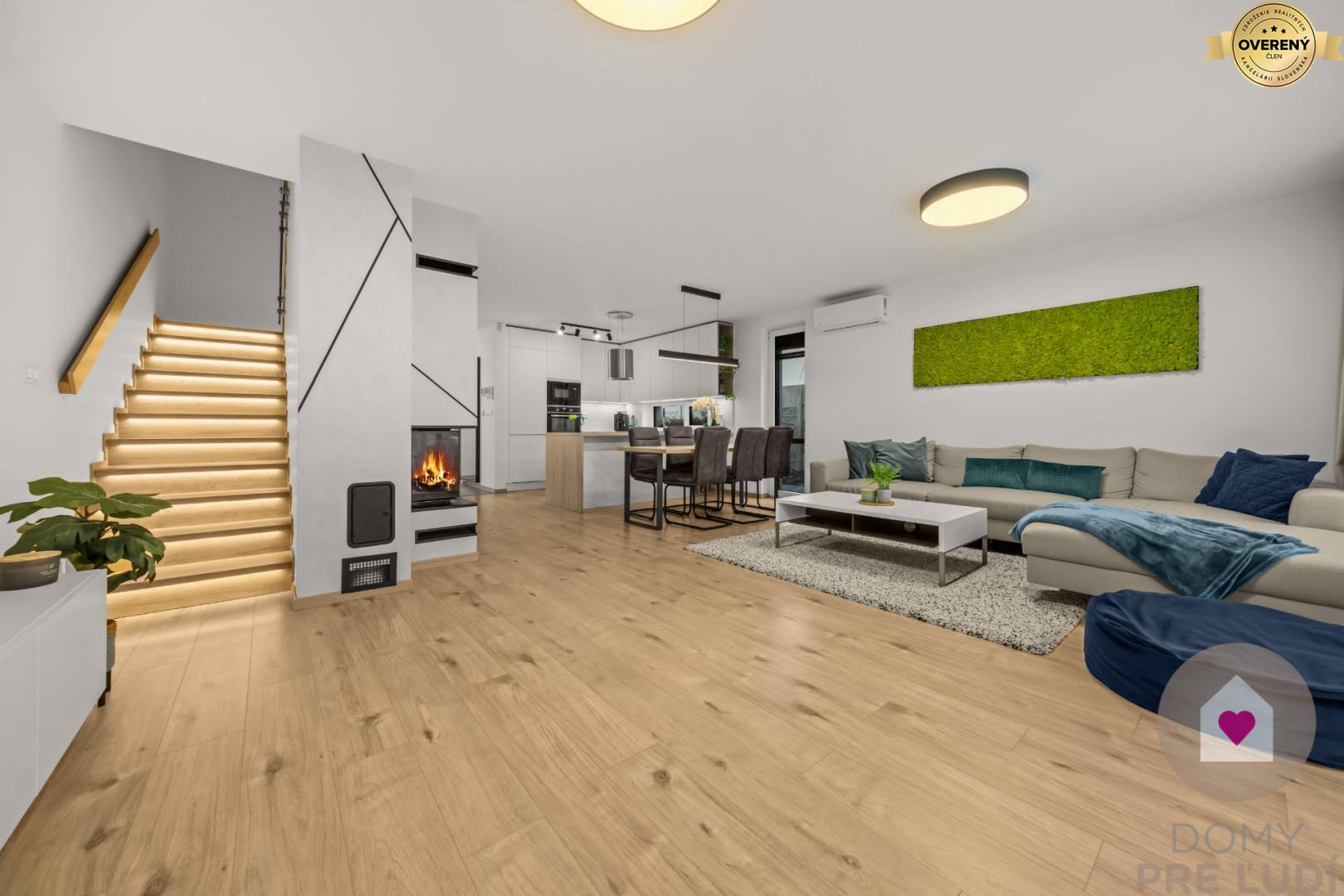 - beépített konyha étkezővel, amely egy tágas nappalihoz csatlakozik. A konyha teljesen felszerelt (modern konyhabútor mosogatóval és beépített gépekkel: hűtőszekrény fagyasztóval, mikrohullámú sütő, elektromos sütő, főzőlap, mosogatógép és páraelszívó). Van még egy étkezőasztal 6 székkel és légkondicionáló egység. A nappaliban sarokkanapé, TV-szekrény, szekrénygarnitúra, dohányzóasztal éskandalló található.