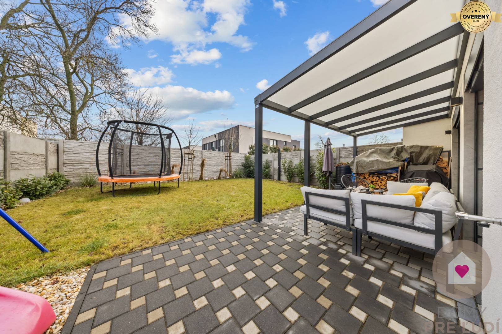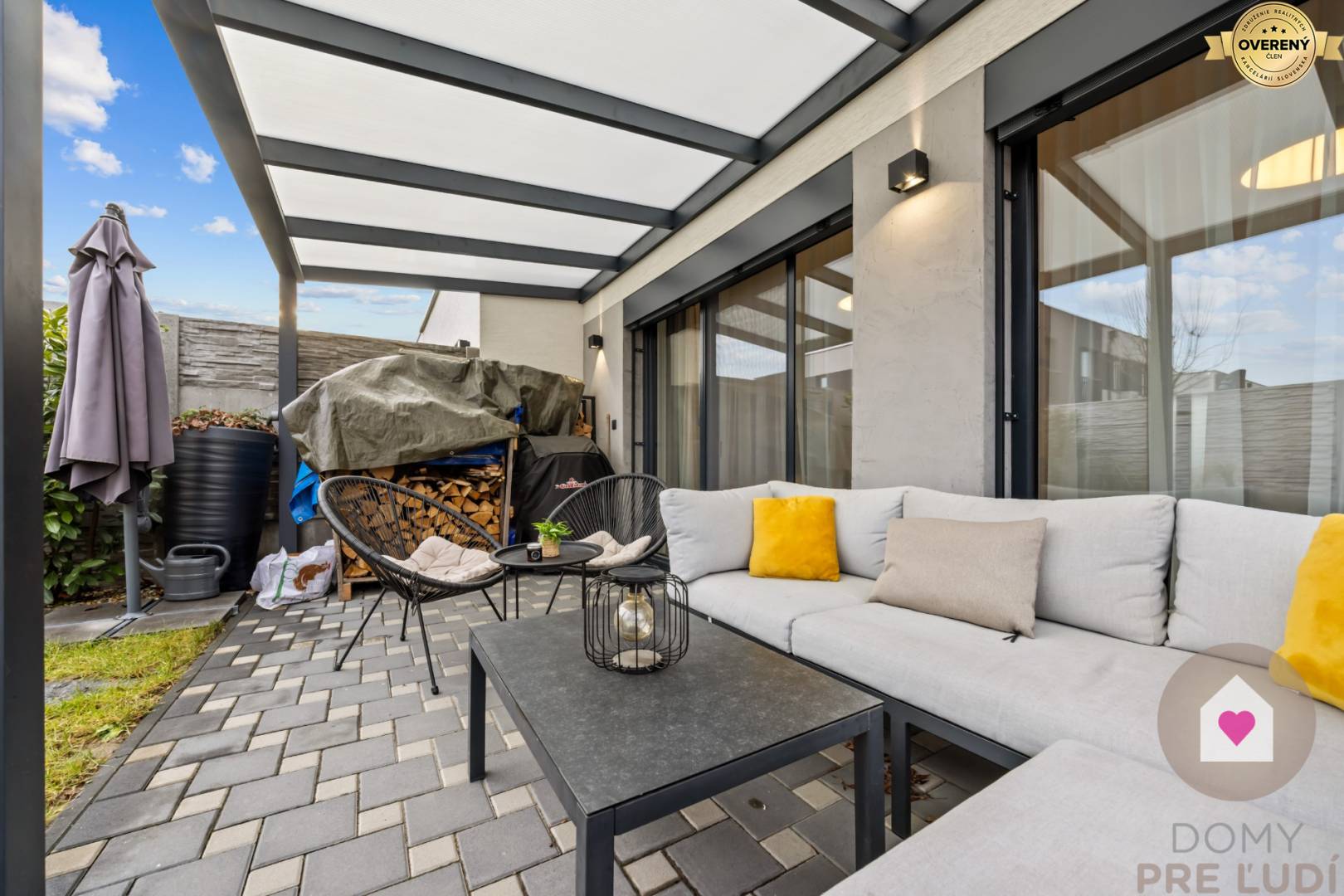 - tágas, teljesen bekerített előkert fedett terasszal, ülősarokkal és kerti házzal, amely a nappaliból közelíthető meg